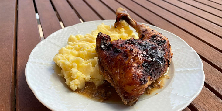 stehno kuřecí, podmáslí, česnek, paprika sušená sladká, povidla švestková, omáčka sojová, sůl, pepř