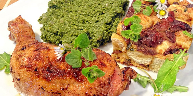 kuře, olej, paprika sušená sladká, máslo, játra kuřecí, máslo, veka, vejce, mléko, petrželka, fialky, listy sedmikrásek, květ muškátový, cibule, vejce, máslo, kopřivy, listy pampelišek, česnek, strouhanka, sůl, pepř mletý, máslo