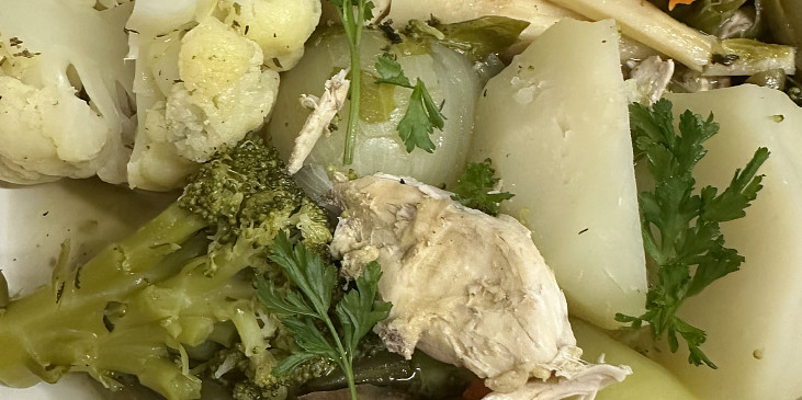 brambory, mrkev, petržel, zelenina, libeček, tymián, koření nové koření, bobkový list, sůl, pepř mletý, máslo, petrželka