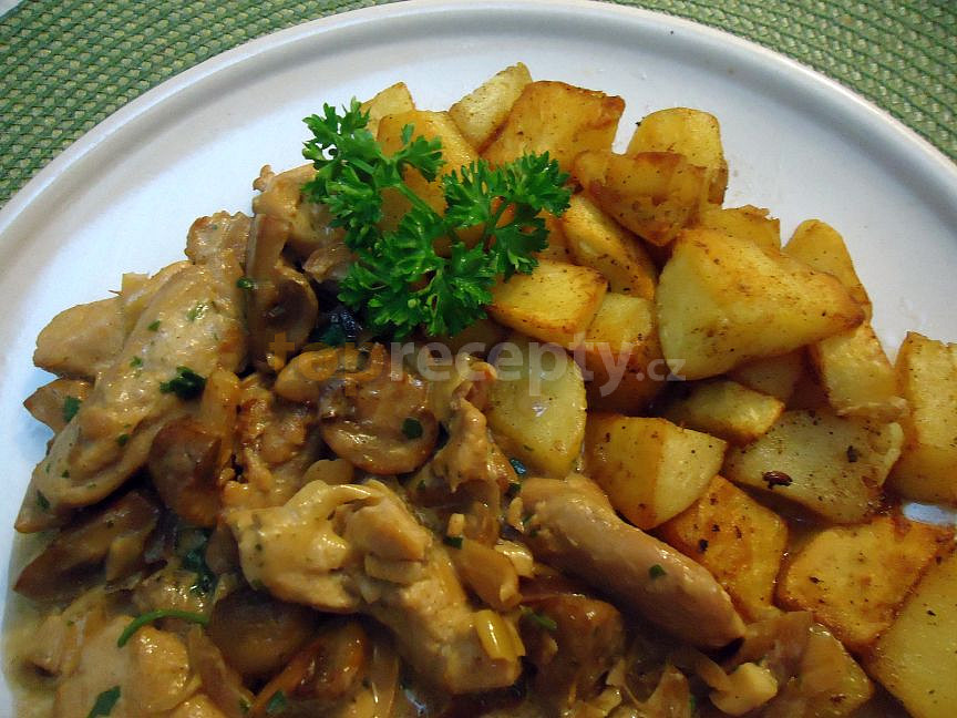 maso kuřecí, sůl, pepř mletý, olej olivový, máslo, žampióny, česnek, cibule šalotka, pórek, víno bílé, smetana zakysaná, petrželka