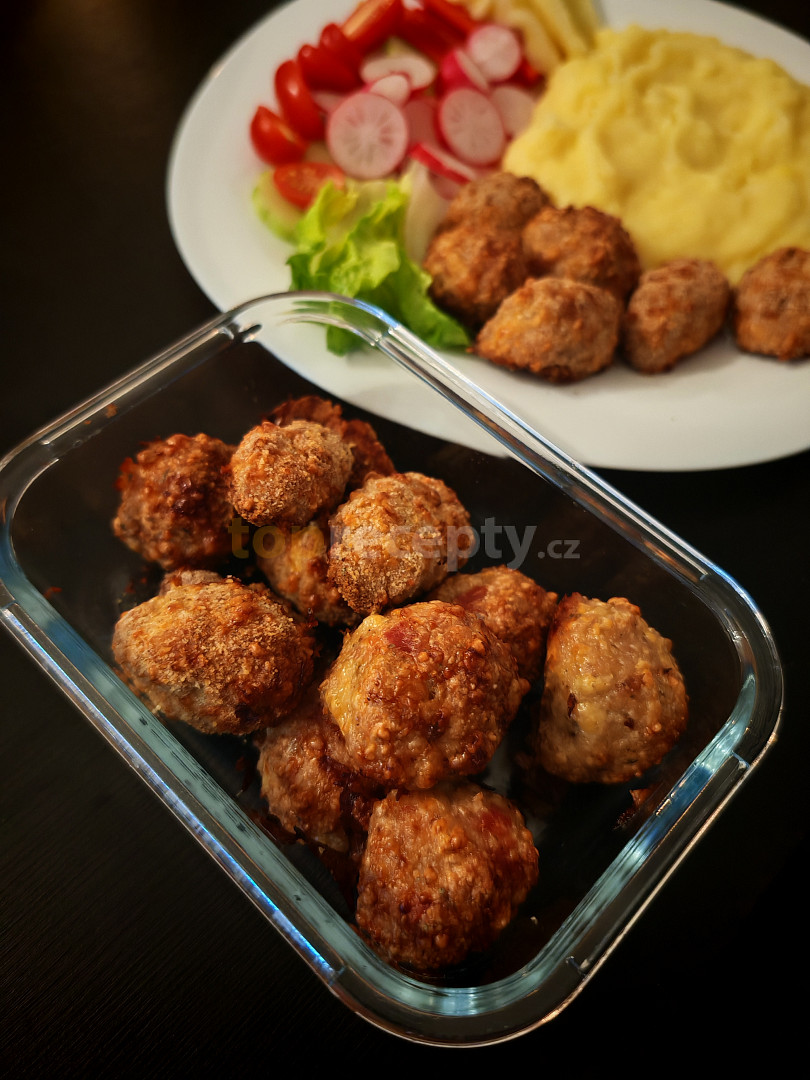 maso kuřecí mleté, sýr eidam, slanina anglická, vejce, majoránka, česnek sušený, česnek, koření na kuře, sůl, sádlo vepřové, strouhanka