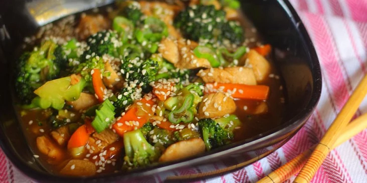 prsa kuřecí, brokolice, mrkev, cibulka jarní, česnek, sůl, pepř, omáčka sojová, cukr kokosový, solamyl, semínka sezamová, olej