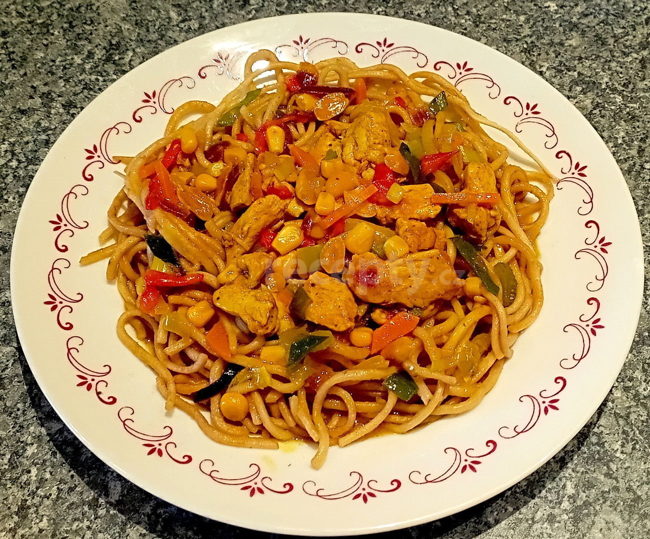 prsa kuřecí, cibule, paprika, mrkev, pórek, celer řapíkatý, kukuřice sterilovaná, nesolené arašídy, solamyl, koření kari, omáčka sojová, pepř mletý, sůl, olej, voda