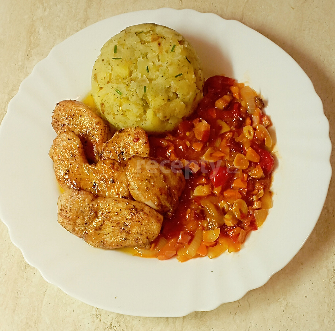 prsa kuřecí, cibule, paprika, chilli paprika čerstvá, rajče, česnek, kečup sladký, omáčka chilli sladká, sůl, pepř mletý, koření, olej, máslo