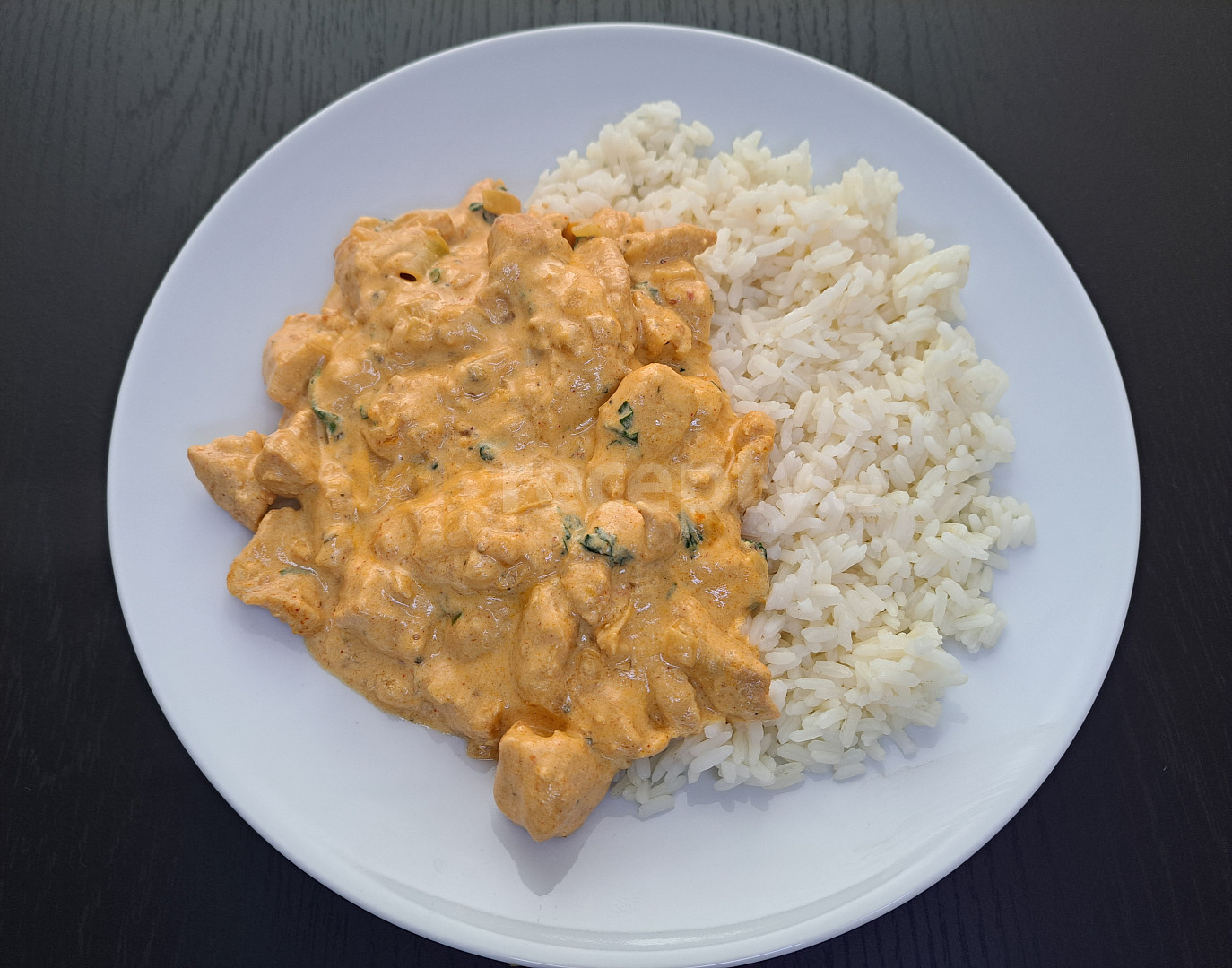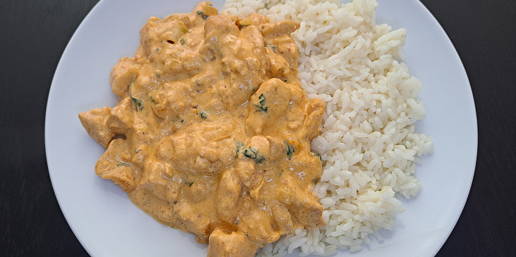 maso kuřecí, cibule, hořčice, vývar masový, smetana ke šlehání, česnek, paprika sušená uzená, sůl, pepř mletý, olej, petrželka, rýže