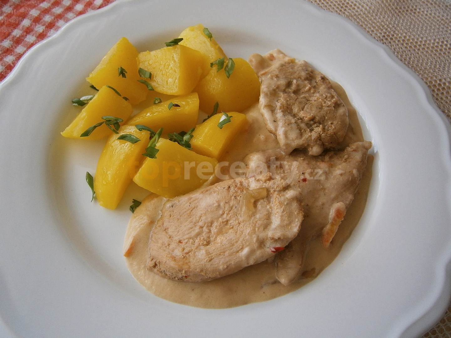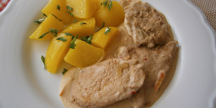 prsa kuřecí, česnek granulovaný, pepř mletý, sůl, omáčka chilli sladká, olej, cibule, omáčka worcesterová, vývar kuřecí, smetana ke šlehání