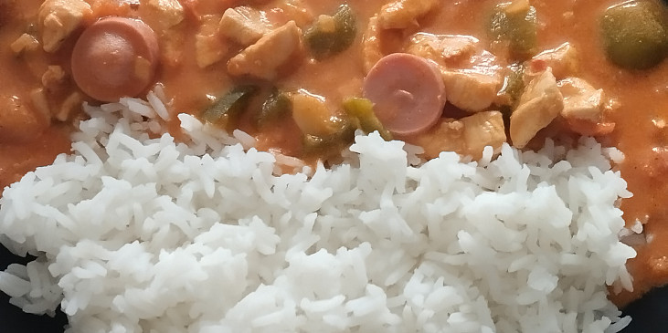 prsa kuřecí, cibule, česnek, párek debrecínský, paprika čerstvá zelená, rajče, protlak, mouka hladká, smetana zakysaná, olej, vývar masový, sůl, pepř mletý, chilli, cukr