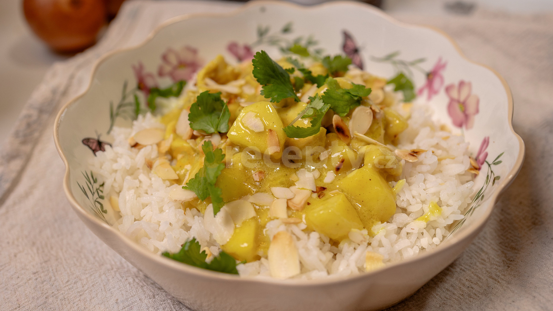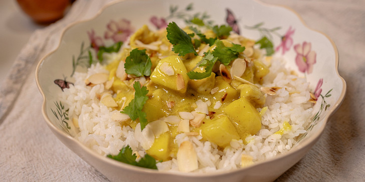 prsa kuřecí, cibule, mléko kokosové, jablko, lupínky mandlové, koření kari, olej olivový, škrob kukuřičný, voda, pepř mletý, sůl