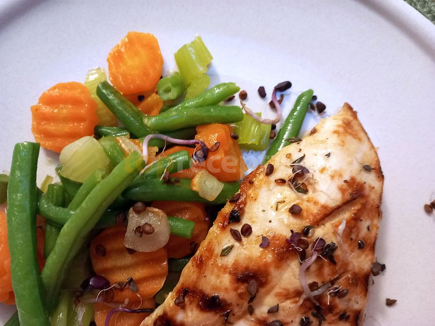 maso kuřecí, pepř čtyř barev, tymián čerstvý, šťáva citronová, česnek, olej olivový, máslo, sůl, mrkev, celer, lusky fazolové mražené, česnek, olej olivový, sůl