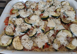 kuskus, vývar zeleninový, olej olivový, rajče, cuketa, česnek, olej olivový, balsamico, koření provensálské, cukr třtinový, sůl, pepř mletý, cibule, olej olivový, cukr třtinový, balsamico, sůl mořská, pepř mletý, sýr mozzarella, bazalka čerstvá
