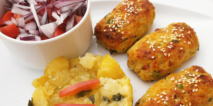 květák, vejce, sýr tvrdý, šunka, hrášek mražený, cibule, škrob bramborový, sůl, pepř mletý, ořech muškátový, olej, strouhanka