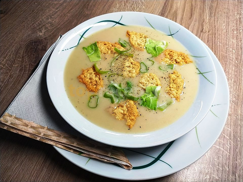 květák, brambory, cibule, máslo, kmín mletý, ořech muškátový, smetana ke šlehání, sůl, pepř mletý, cibulka jarní, sýr nastrouhaný