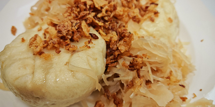 mouka polohrubá, sůl, cukr krupice, droždí, voda, maso uzené, cibule, sádlo, sůl, pepř, česnek, špenát, zelí kysané, cibule