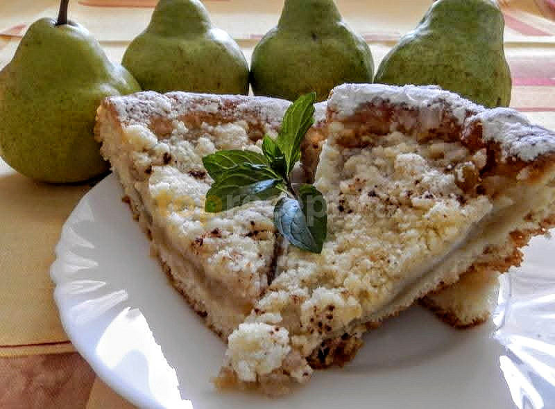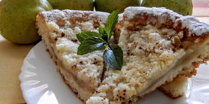 mouka hladká, sůl, droždí čerstvé, mléko, vejce, žloutek, máslo, cukr, kůra citronová, hruška, cukr vanilkový, cukr krupice, skořice mletá, pudink vanilkový, mouka hrubá, cukr moučkový, máslo, vejce, máslo, rum