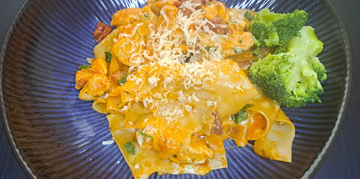 prsa kuřecí, těstoviny lasagne, rajče sušené, vývar kuřecí, smetana ke šlehání, česnek, protlak rajčatový, sýr mozzarella strouhaná, sýr parmazán strouhaný, koření oregáno, paprika sušená sladká, česnek sušený, sůl, pepř mletý, olej, čerstvé bylinky