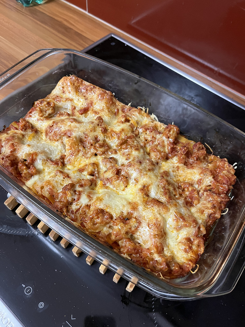 těstoviny lasagne, maso mleté, protlak rajčatový, česnek, mrkev, celer, sýr gouda, majoránka, koření oregáno, sůl, pepř mletý, olej