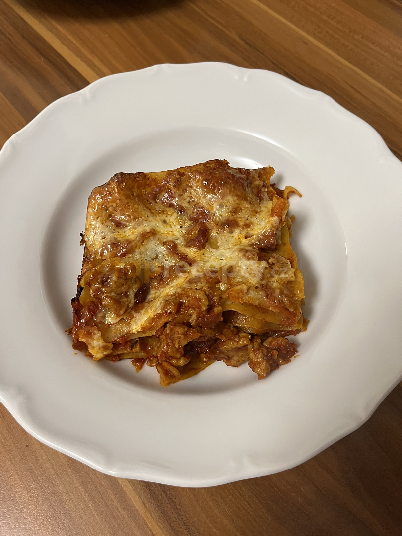 těstoviny lasagne, maso mleté, protlak rajčatový, česnek, mrkev, celer, sýr gouda, majoránka, koření oregáno, sůl, pepř mletý, olej