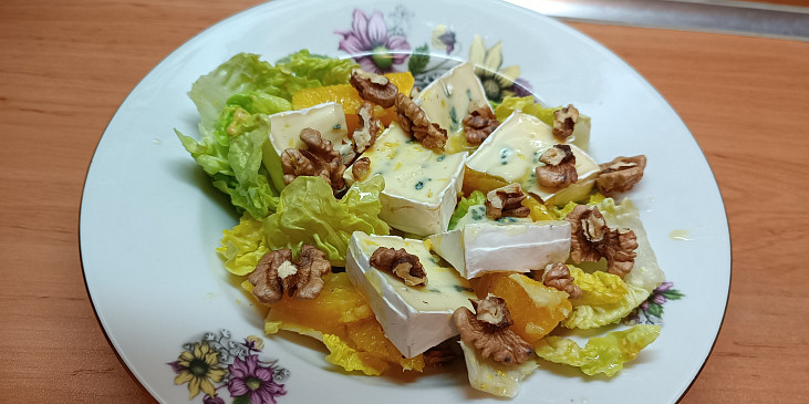 salát ledový, pomeranče, sýr s modrou plísní, ořechy vlašské, šťáva citronová, hořčice medová, sůl, olej olivový, pepř zelený