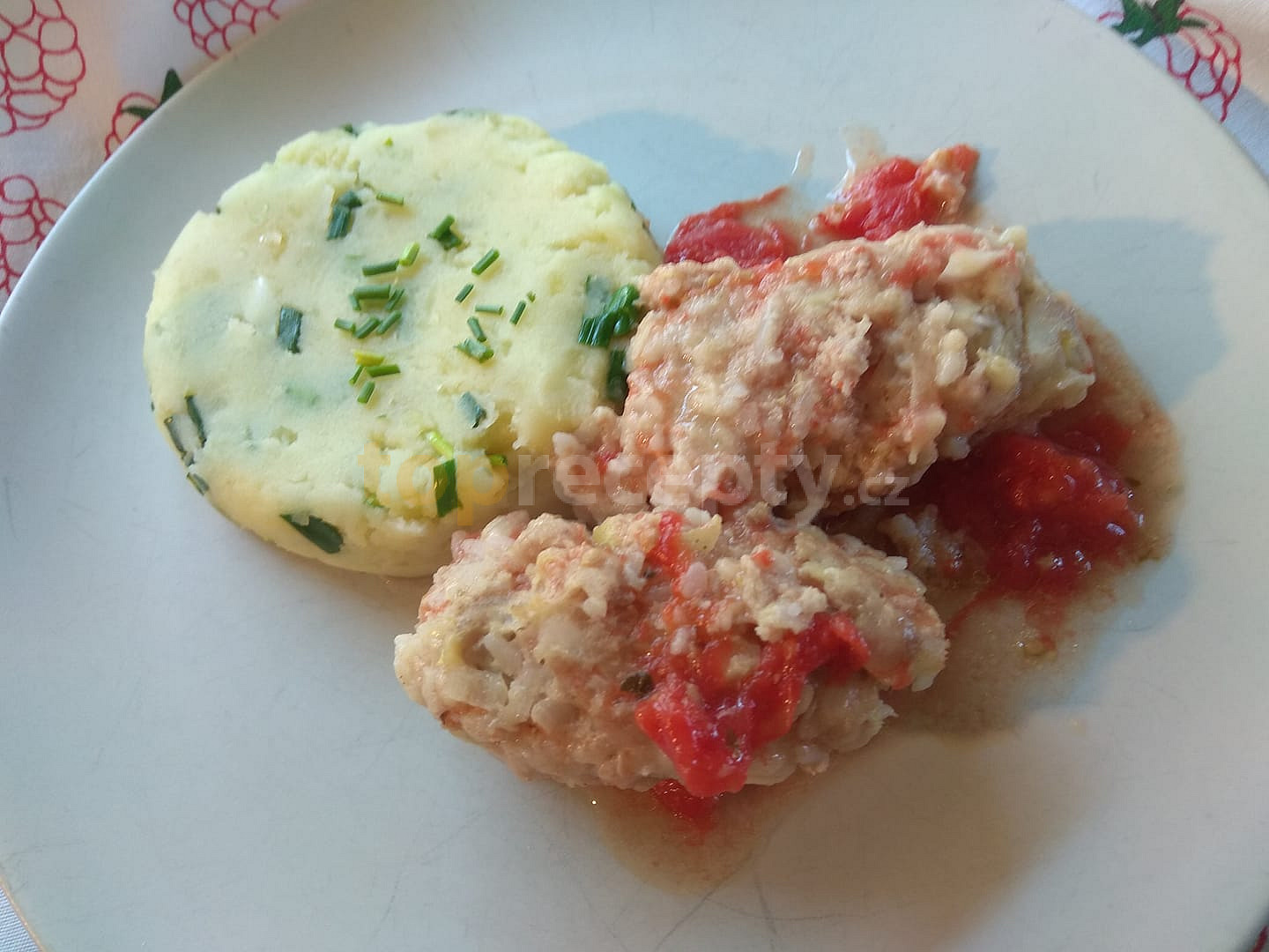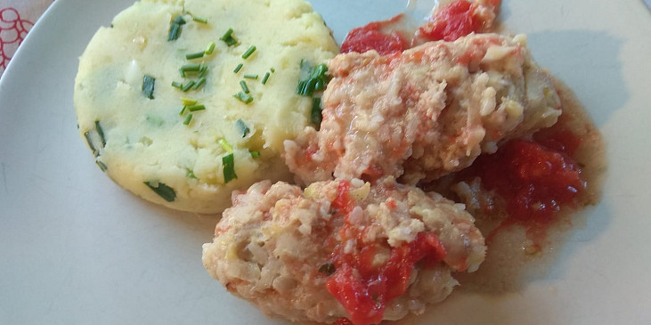 maso mleté, zelí bílé, rýže, vejce, cibule, olej, česnek, pepř černý, sůl, mouka hladká, šťáva rajčatová, voda, bobkový list, koření oregáno, sůl, pepř mletý, mouka, olej