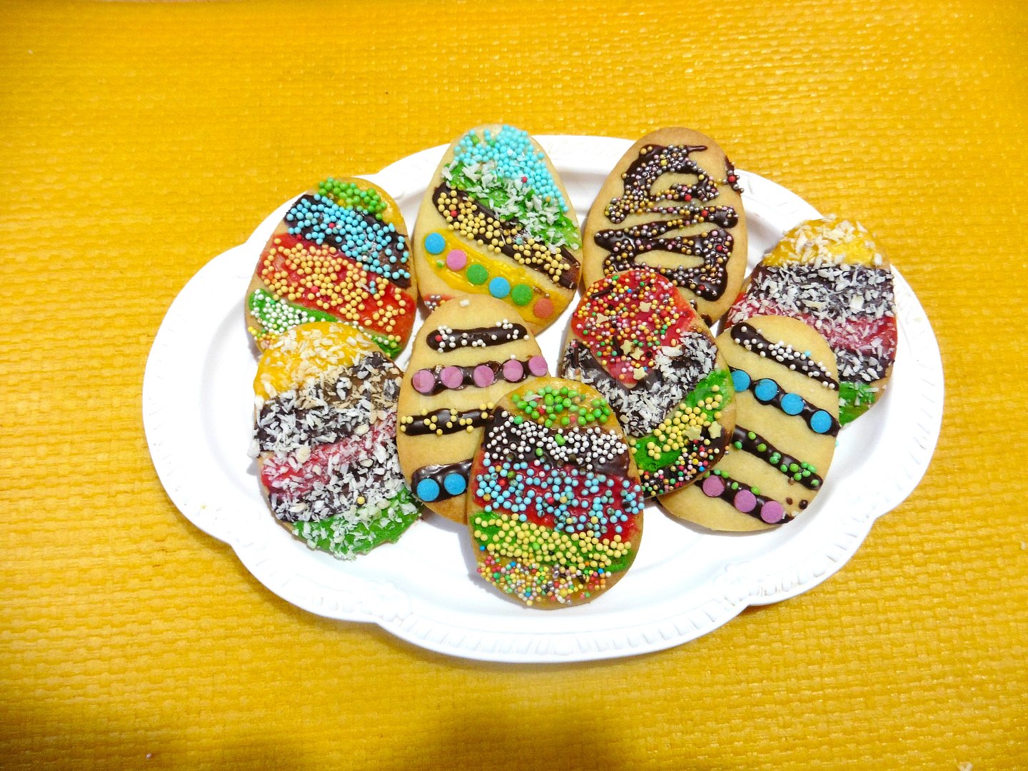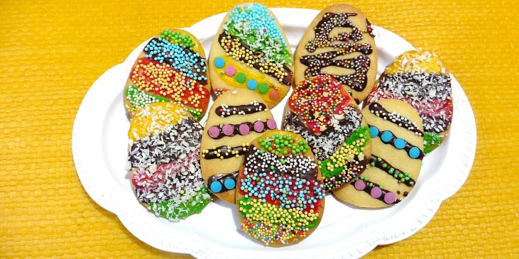 mouka hladká, máslo, cukr moučkový, žloutek, cukr vanilkový, kůra citronová, skořice, čokoláda na vaření, čokoláda bílá, potravinářské barvivo gelové, zdobení, kokos strouhaný