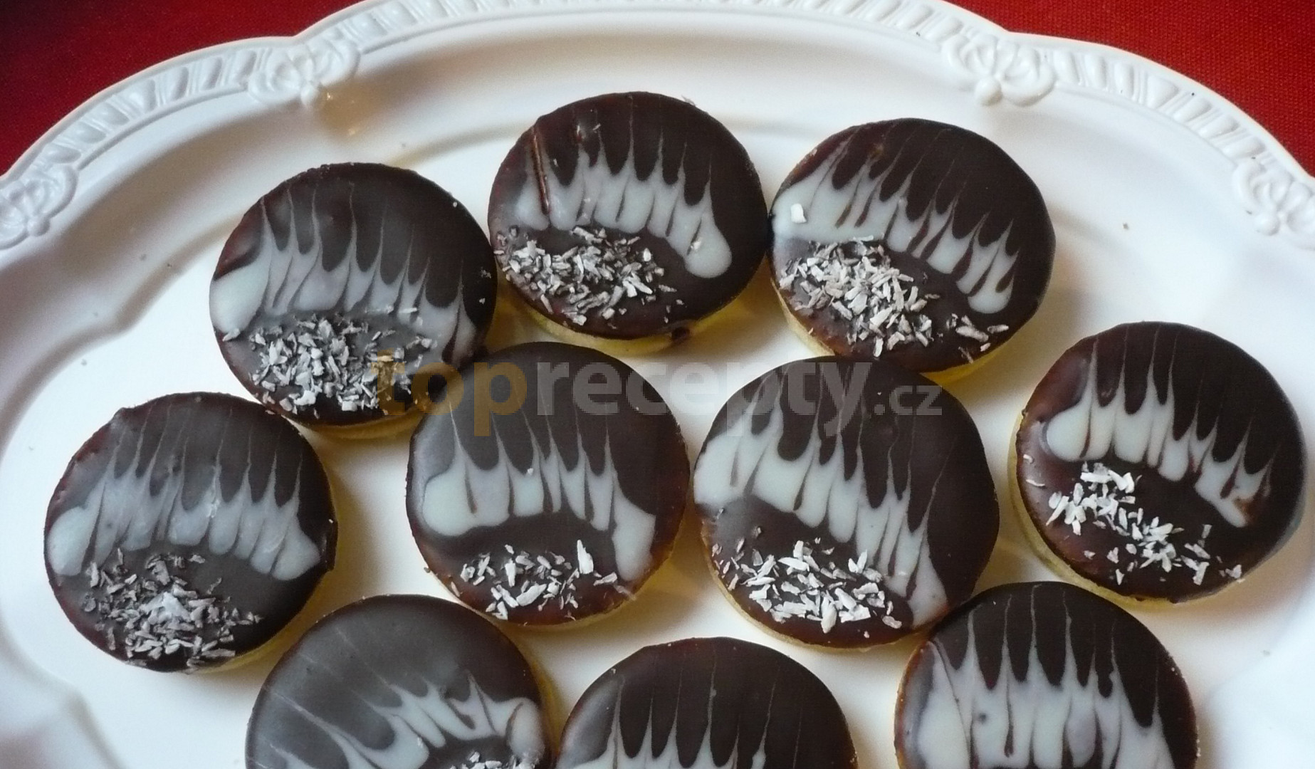 mouka hladká, máslo, cukr moučkový, žloutek, cukr vanilkový, máslo, cukr moučkový, kokos strouhaný, čokoláda tmavá, čokoláda bílá, tuk ztužený, kokos