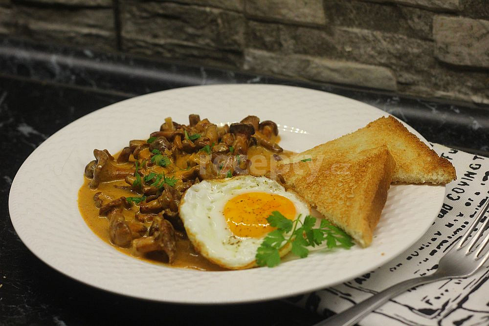 houby lišky, cibule, sůl, pepř, paprika sušená sladká, mouka hladká, smetana na vaření, petrželka, vejce, chléb toustový, olej