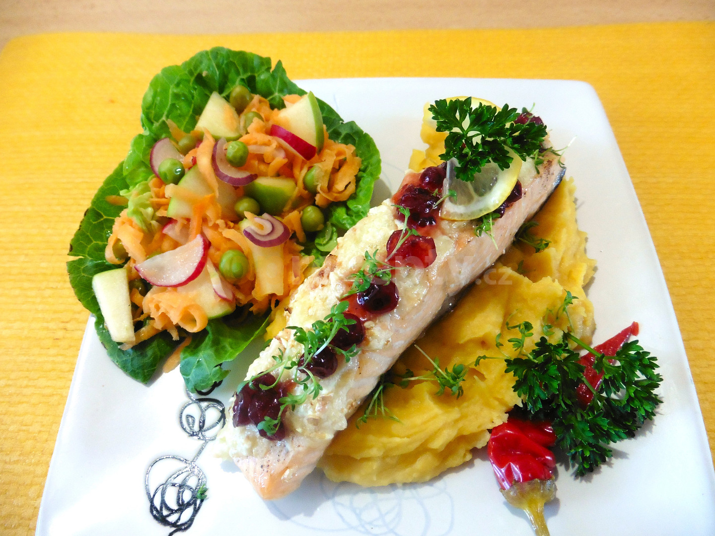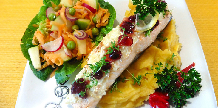 losos, citron, sýr hermelín, máslo, smetanový křen, sůl, pepř mletý, marmeláda brusinková, řeřicha, citron, chilli paprika čerstvá
