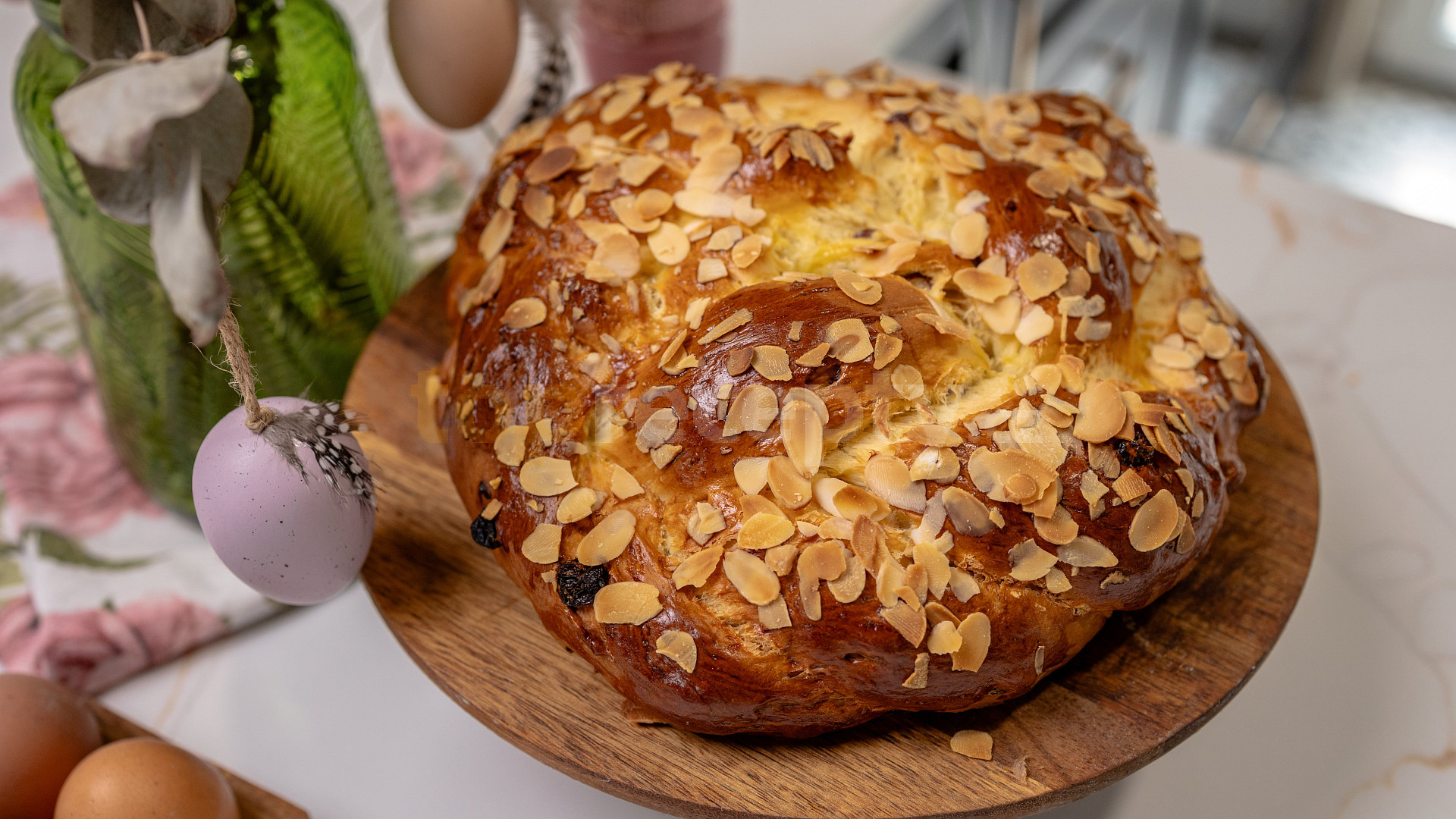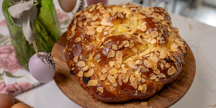 mouka polohrubá, droždí čerstvé, cukr krupice, cukr vanilkový, mléko, máslo, žloutek, sůl, kůra citronová, rozinky, mandle sekané, vejce, rum, lupínky mandlové