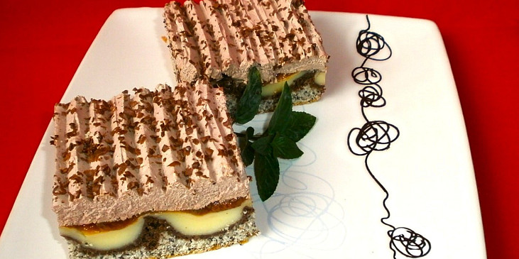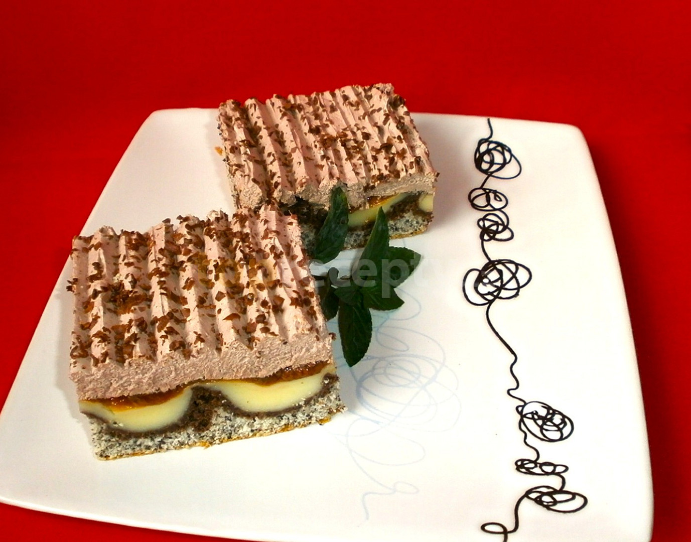 vejce, mák mletý, cukr moučkový, olej, voda, mouka hladká, kypřící prášek do pečiva, kakao, mléko, pudink vanilkový, cukr krystal, cukr moučkový, smetana ke šlehání, čokoláda hořká, ztužovač šlehačky, kakao, marmeláda