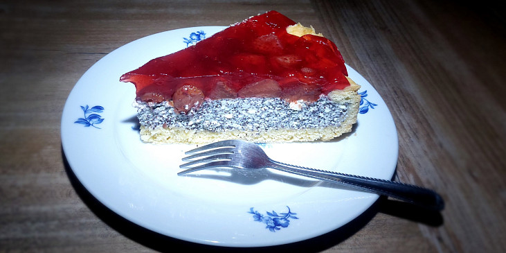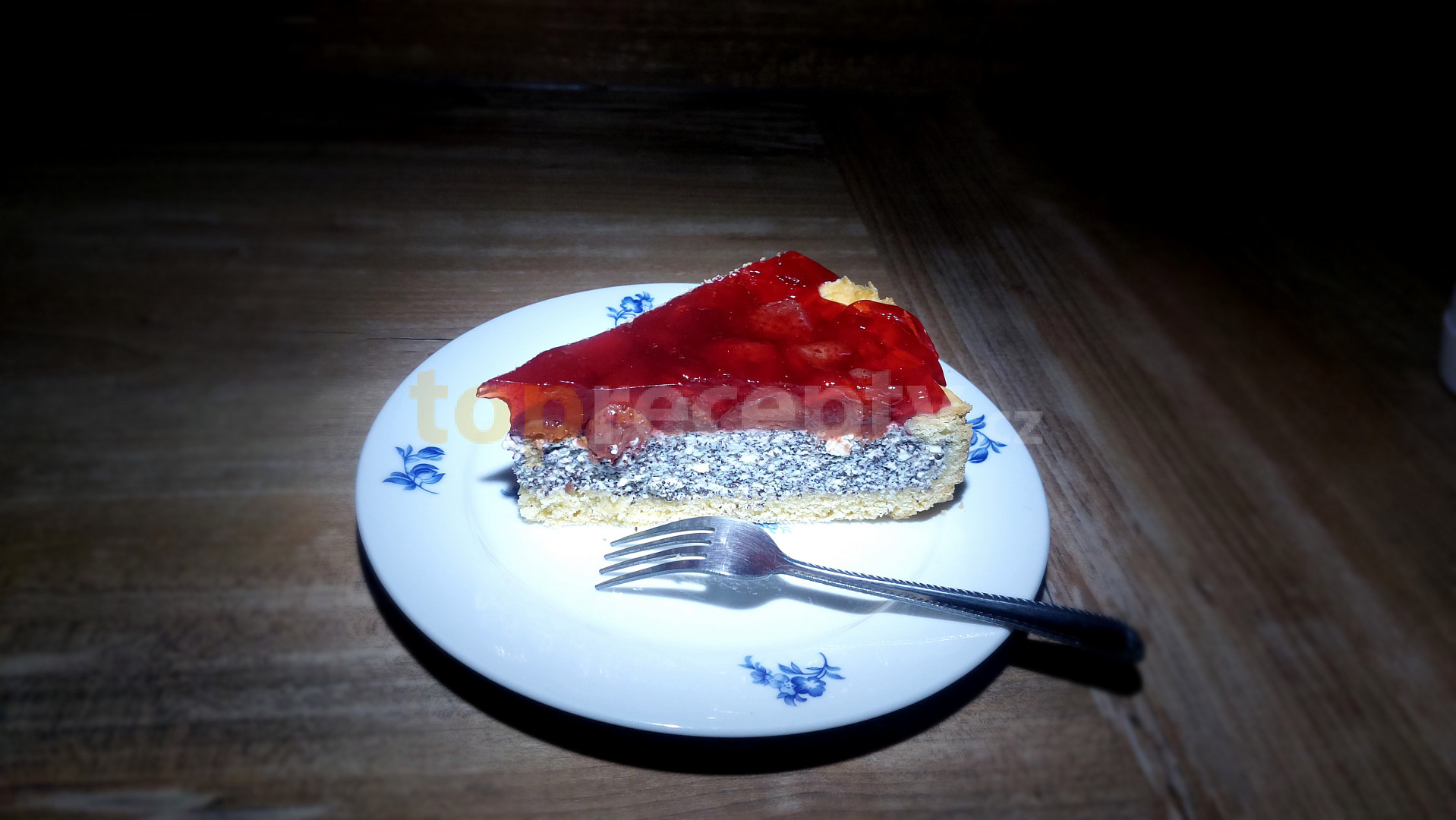 mouka hladká, kypřící prášek, cukr moučkový, cukr vanilkový, tuk, vejce, tvaroh měkký, cukr krupice, cukr vanilkový, vejce, mák mletý, jahody čerstvé, želé dortové