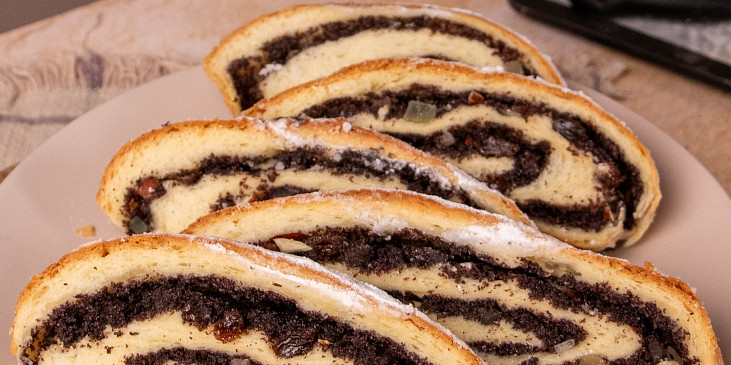 mouka hladká, droždí čerstvé, mléko, cukr krupice, citron, sůl, vejce, máslo, mák mletý, mléko, cukr krupice, mandle sekané, citronáta, rozinky v rumu, máslo, cukr moučkový