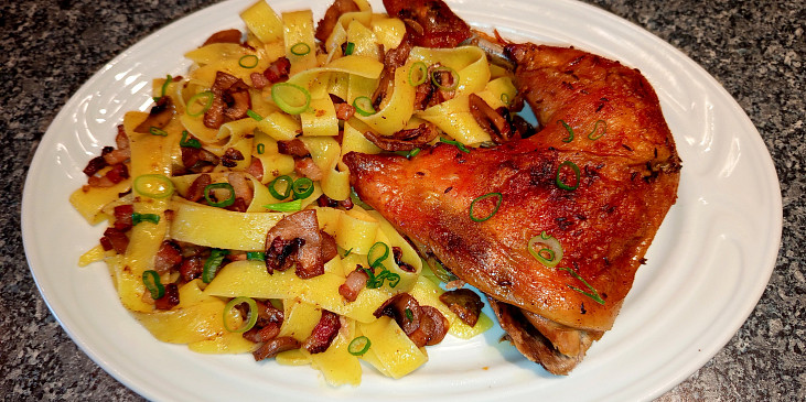 kuře, sůl, máslo, slanina, voda, nudle široké, cibule, tuk, játra vepřová, žampióny