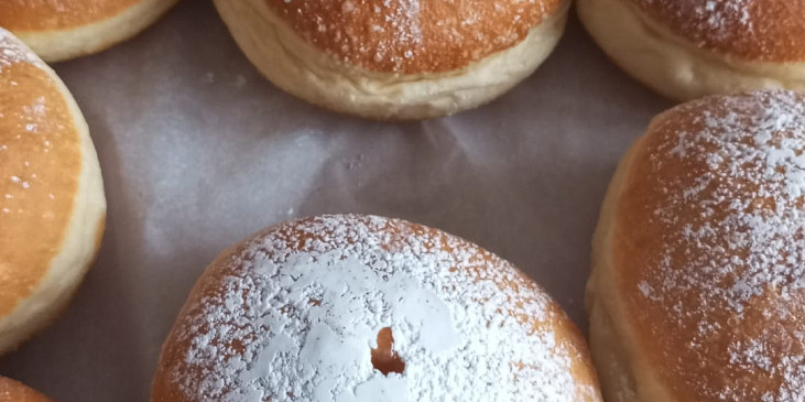 mouka hladká, mouka polohrubá, cukr krupice, máslo, žloutek, rum, droždí čerstvé, mléko, sůl, kůra citronová, marmeláda, cukr moučkový, olej