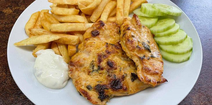 kuřecí stehenní řízky, olej, tatarská omáčka, hořčice plnotučná, hořčice kremžská, paprika sušená sladká, česnek sušený, libeček, sůl, pepř mletý