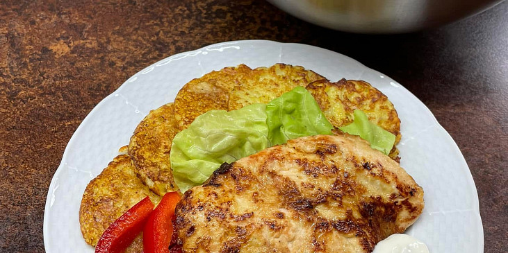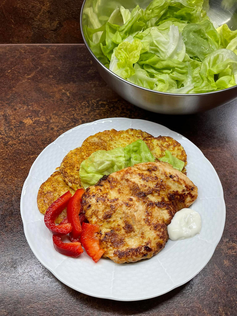 prsa kuřecí, omáčka sojová, omáčka worcesterová, hořčice, solamyl, vejce, smetana na vaření, sůl, pepř, česnek sušený, brambory, vejce, mléko, česnek, pepř, sůl, majoránka, mouka hladká, olej