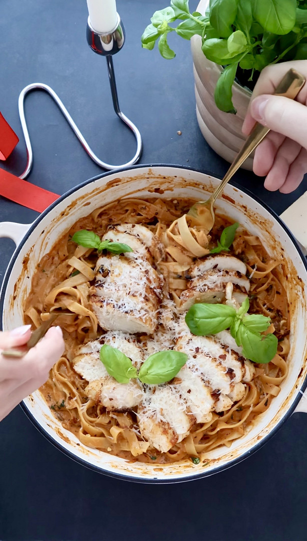prsa kuřecí, cibule sušená, česnek sušený, paprika sušená sladká, máslo, cibule, česnek, smetana ke šlehání, bylinky sušené, rajče sušené, sůl, pepř, těstoviny, parmazán, bazalka čerstvá