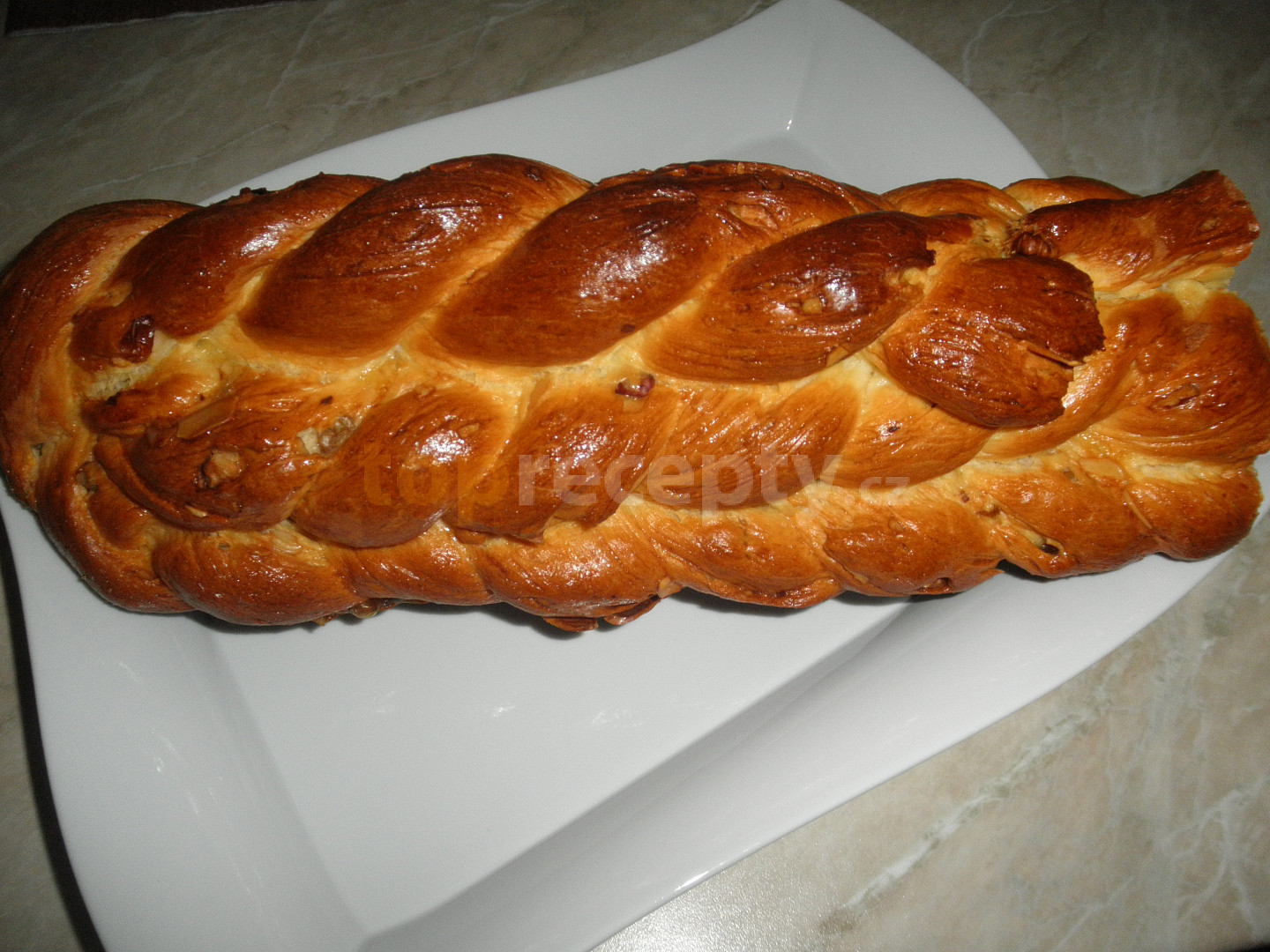 mouka polohrubá, droždí čerstvé, cukr moučkový, máslo, žloutek, sůl, mléko, kypřící prášek do pečiva, rozinky, mandle loupané, mandle plátkové, vejce
