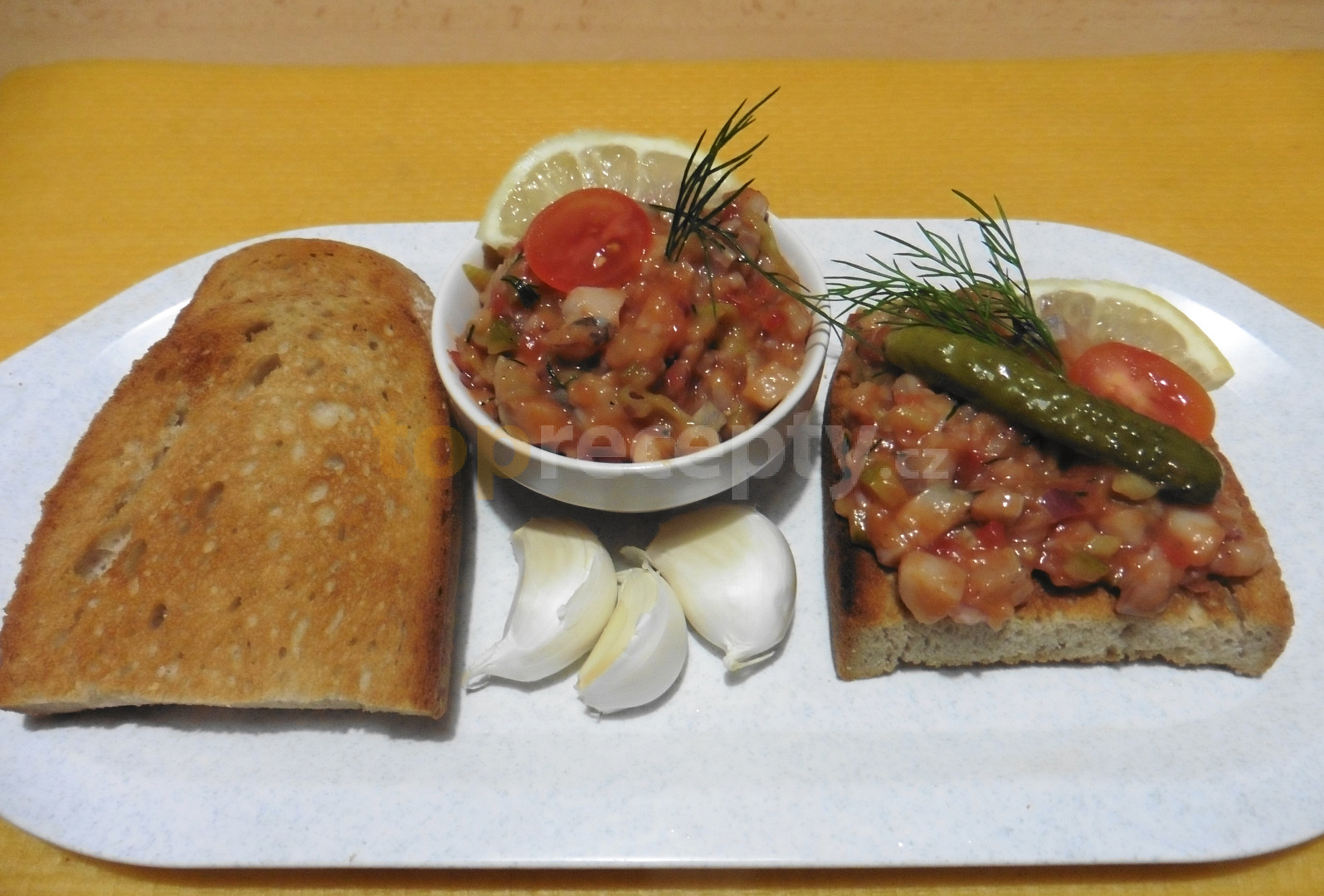 matjesy v oleji, kečup sladký, omáčka worcesterová, chilli paprika čerstvá, cibule, okurky sterilované, rajče cherry, olej olivový, hořčice, kopr, paprika sušená uzená, sůl, pepř mletý, rajče cherry, okurka čerstvá, citron, kopr, topinka, česnek