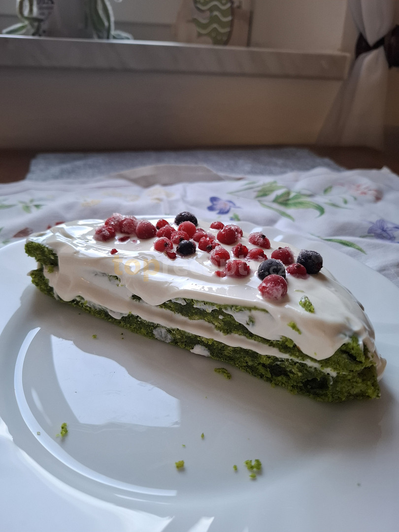 špenát čerstvý, vejce, mouka polohrubá, olej slunečnicový, cukr krystal, cukr vanilkový, kypřící prášek, mascarpone, smetana ke šlehání, limetka, cukr, ovoce