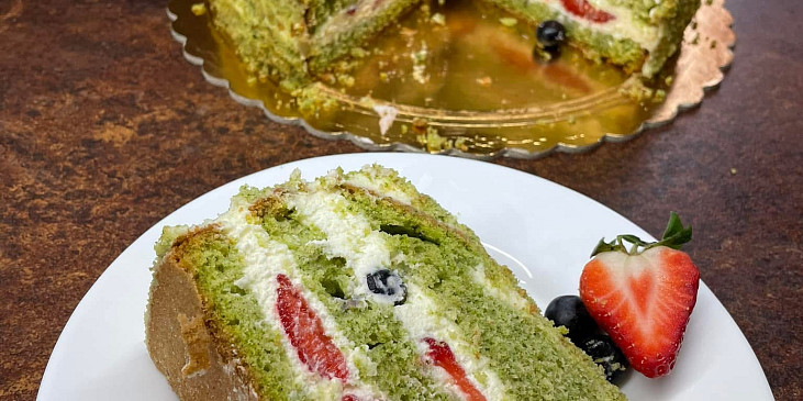 špenát čerstvý, vejce, mouka polohrubá, olej slunečnicový, cukr krystal, cukr vanilkový, kypřící prášek, mascarpone, smetana ke šlehání, limetka, cukr, ovoce