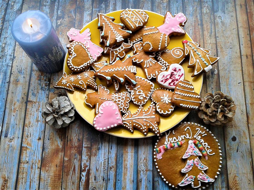 mouka hladká, soda jedlá, prášek do perníku, máslo, vejce, med, koření do perníku, cukr moučkový, žloutek, bílek, cukr moučkový, šťáva citronová, škrob kukuřičný, zdobení cukrářské