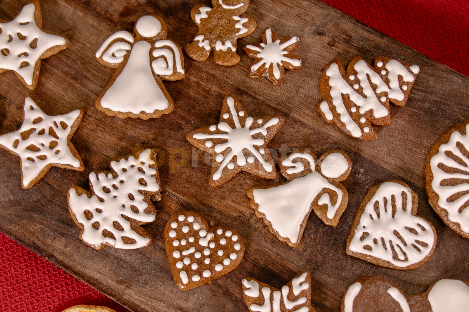 mouka hladká, med, cukr moučkový, máslo, žloutek, koření do perníku, soda jedlá, mléko, kakao, voda, vejce, cukr moučkový, bílek, šťáva citronová