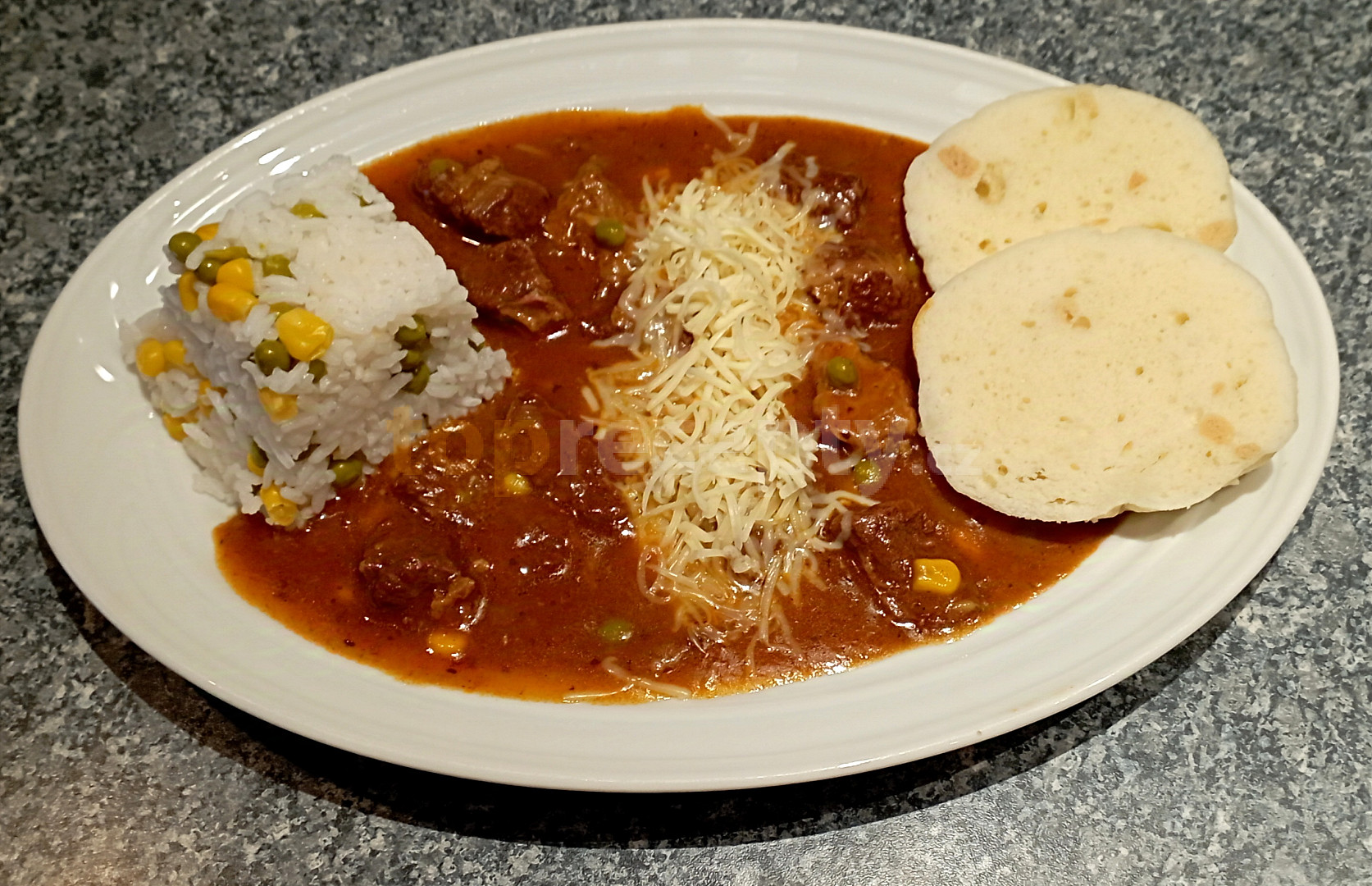 maso mleté, lečo, fazole bílé, fazole červené, kukuřice sterilovaná, chilli, sůl, sádlo, mouka hladká, smetana zakysaná, sýr strouhaný
