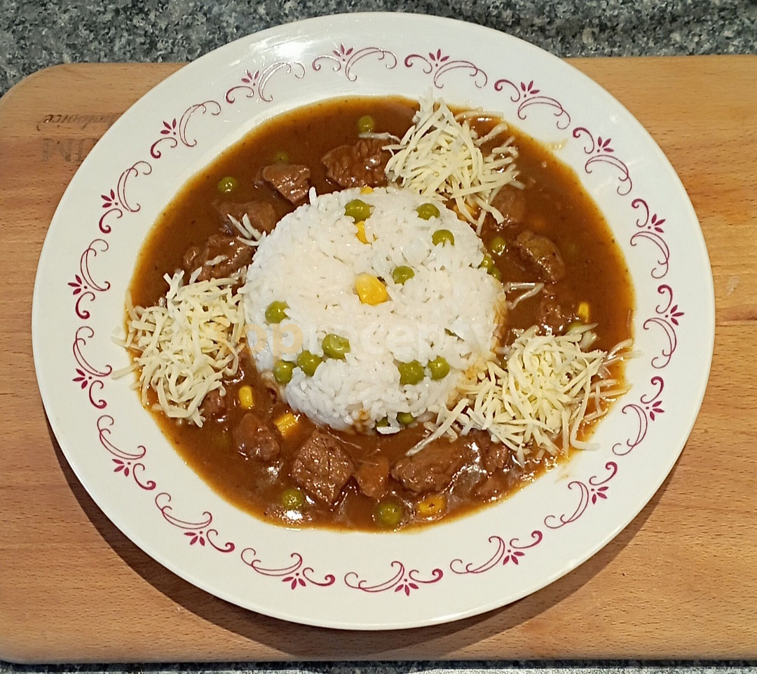 krk hovězí, hrášek sterilovaný, kukuřice sterilovaná, sýr tvrdý, protlak rajčatový, cibule, česnek, mouka hladká, paprika sušená uzená, olej, cukr krystal, pepř mletý, sůl, voda