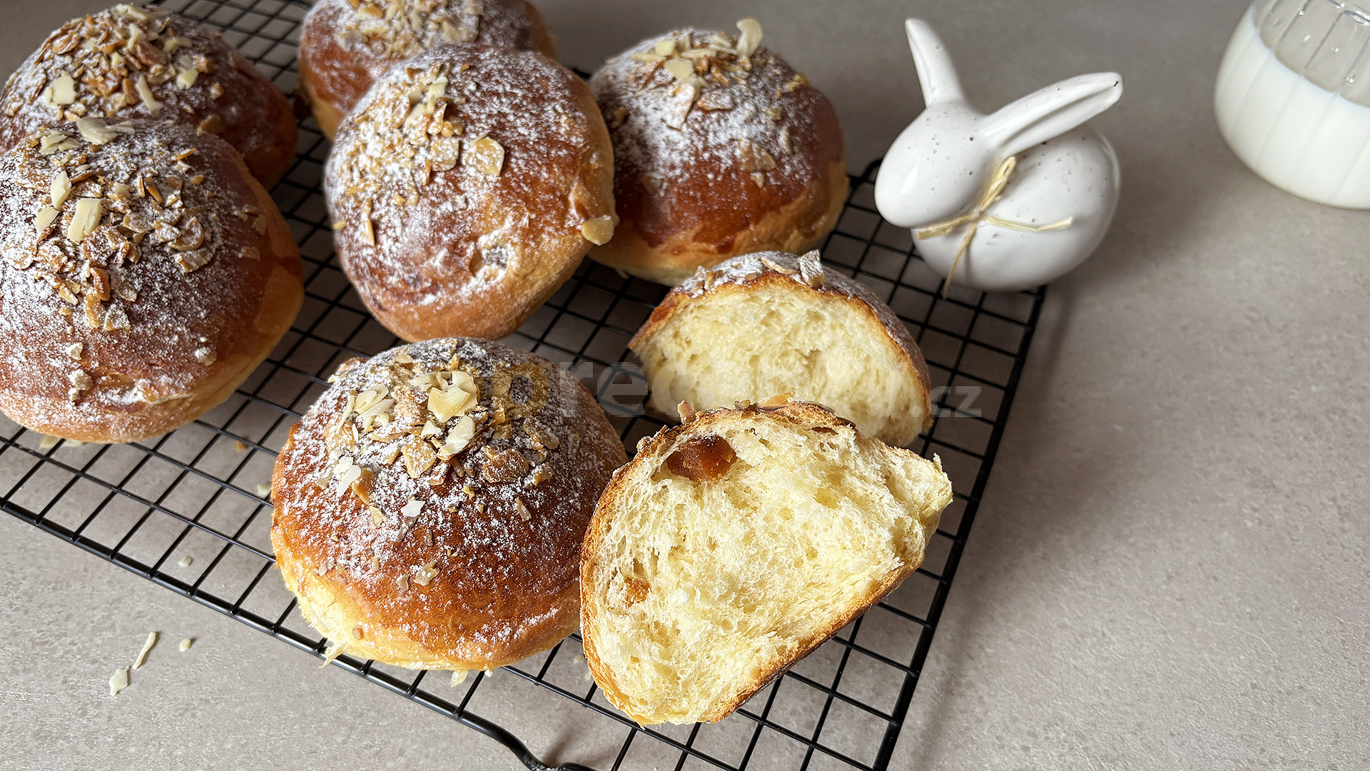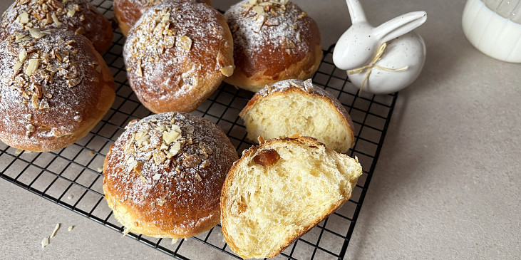 mouka hladká, mouka polohrubá, mléko, máslo, cukr krystal, meruňky sušené, droždí čerstvé, cukr vanilkový, žloutek, vejce, mandle plátkové