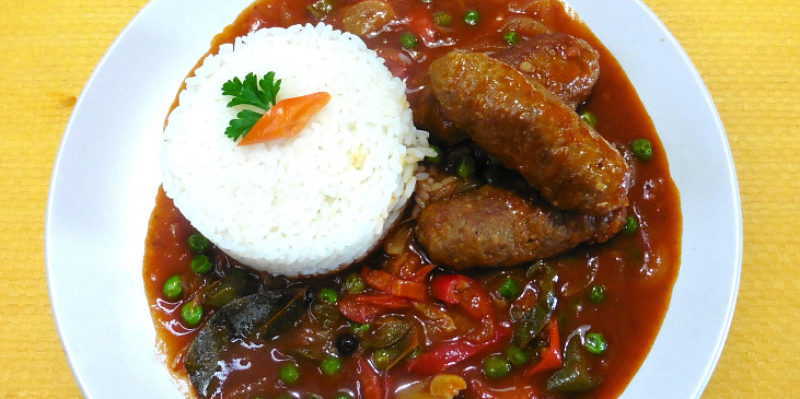 maso vepřové, voda, škrob bramborový, sůl, pepř mletý, sádlo, vývar masový, slanina, cibule, česnek, paprika čerstvá červená, paprika čerstvá zelená, hrášek, protlak rajčatový, omáčka sojová, kmín celý, koření nové koření, paprika sušená sladká, mouka polohrubá, paprika sušená pálivá, pepř mletý, sůl