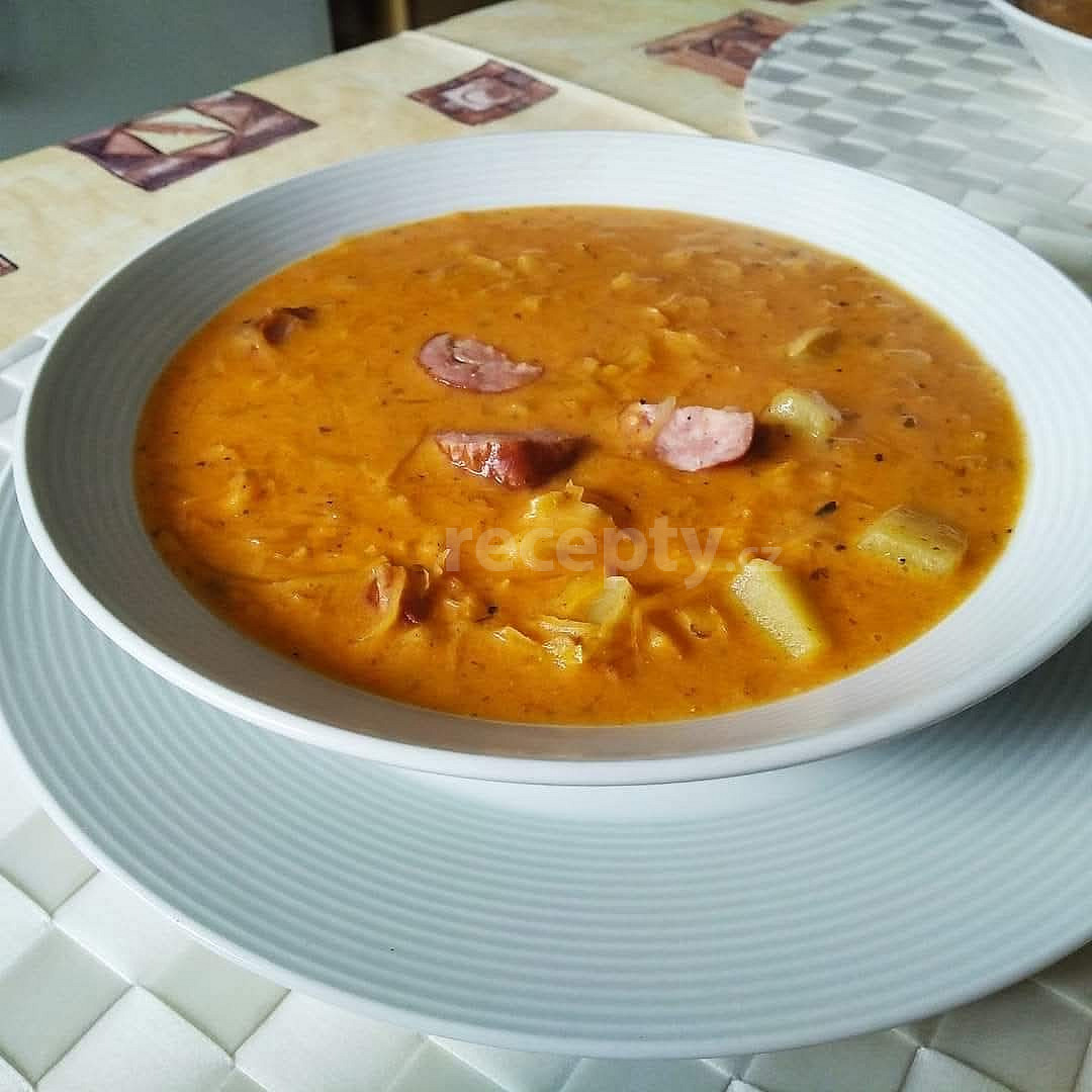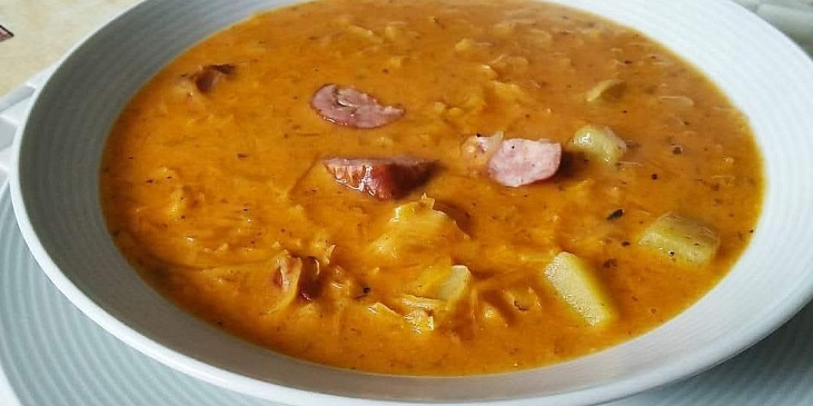 maso uzené, klobása pikantní, brambory, zelí kysané, cibule, sádlo, mouka hladká, paprika sušená sladká, vývar masový, majoránka, sůl, pepř mletý, cukr