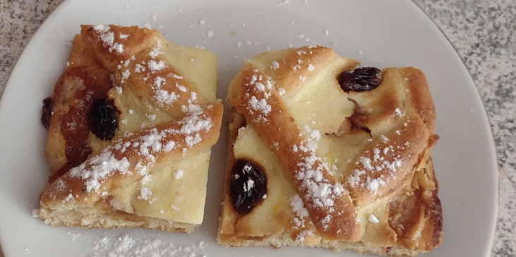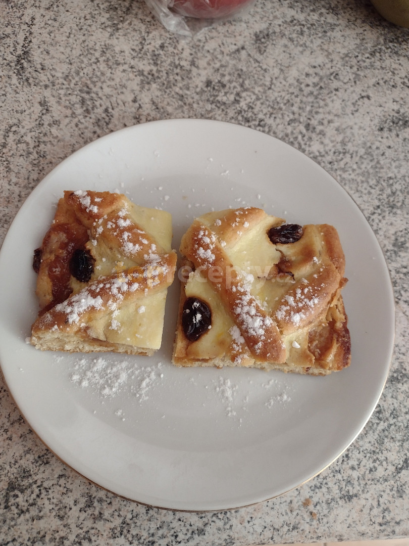 mouka hladká, brambory, cukr moučkový, máslo, vejce, prášek do pečiva, mléko, extrakt vanilkový, kůra citronová, tvaroh jemný, cukr vanilkový, máslo, vejce, rozinky, kůra citronová, marmeláda rybízová