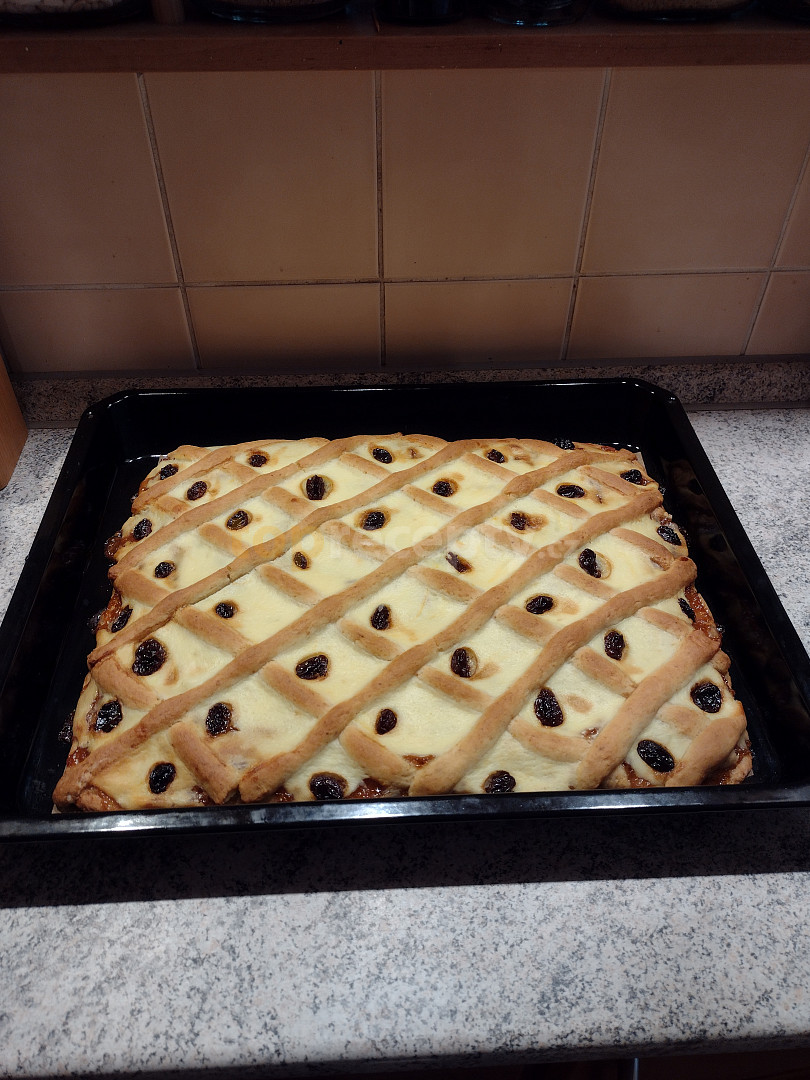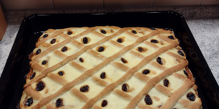 mouka hladká, brambory, cukr moučkový, máslo, vejce, prášek do pečiva, mléko, extrakt vanilkový, kůra citronová, tvaroh jemný, cukr vanilkový, máslo, vejce, rozinky, kůra citronová, marmeláda rybízová