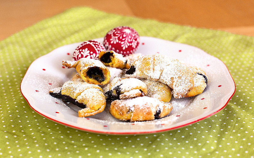 mrkev, vejce, mouka hrubá, máslo, kypřící prášek do pečiva, cukr vanilkový, povidla švestková, mouka hladká, bílek, cukr moučkový
